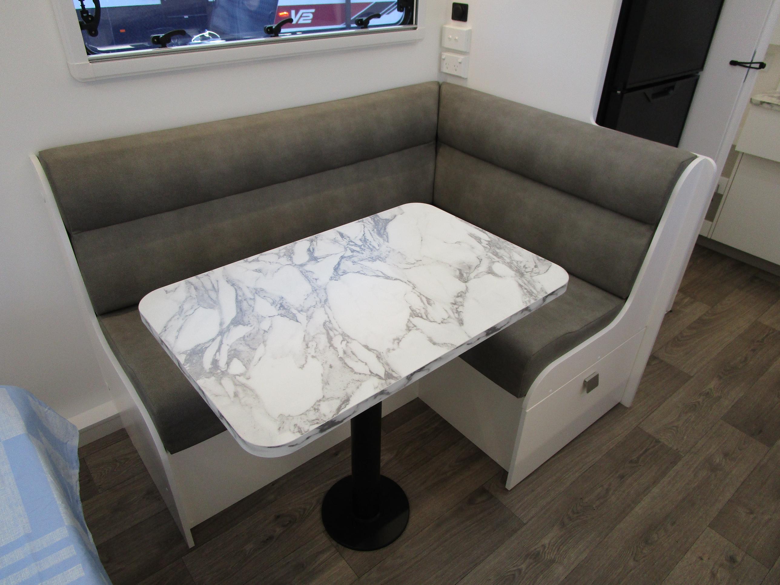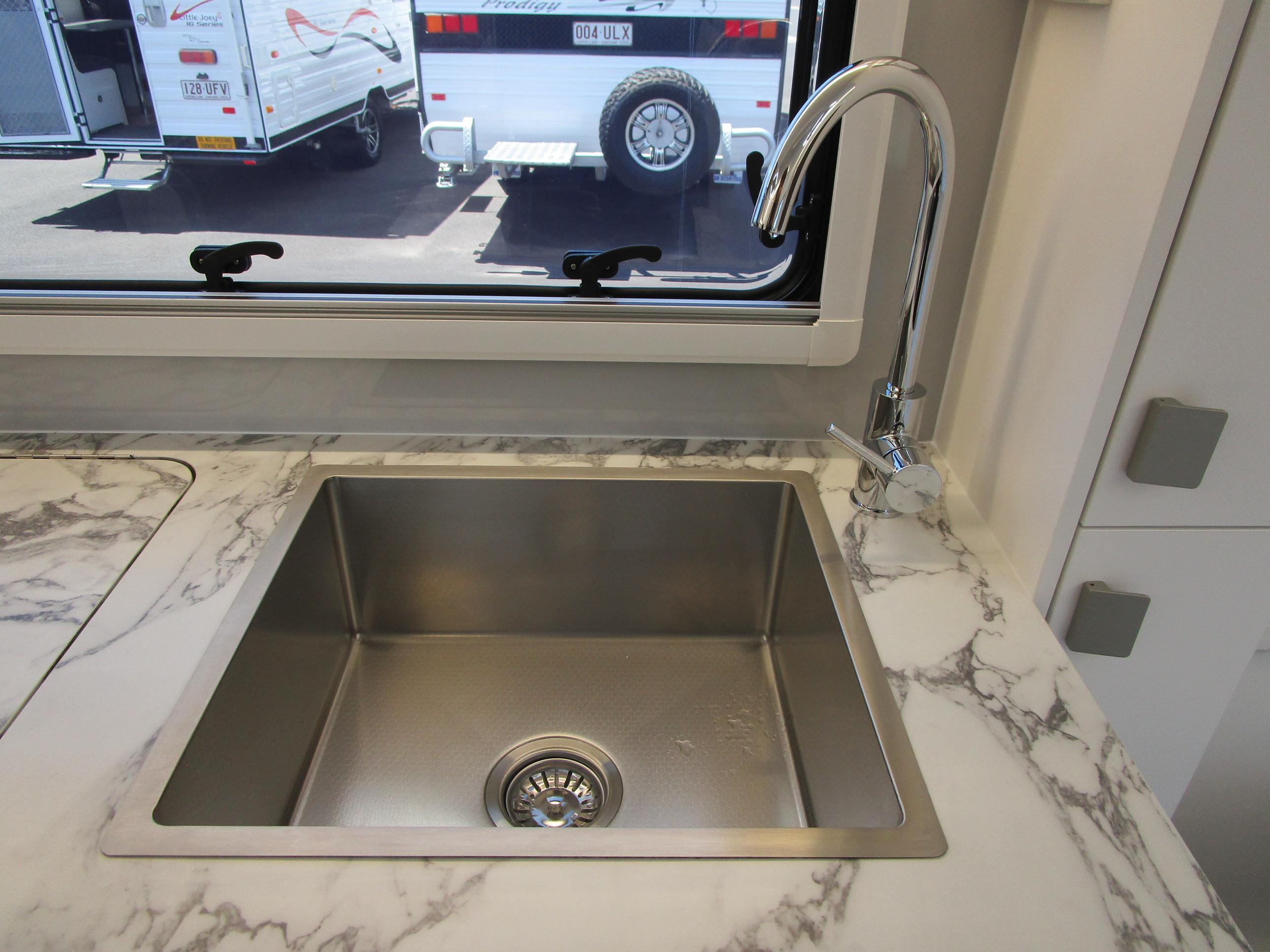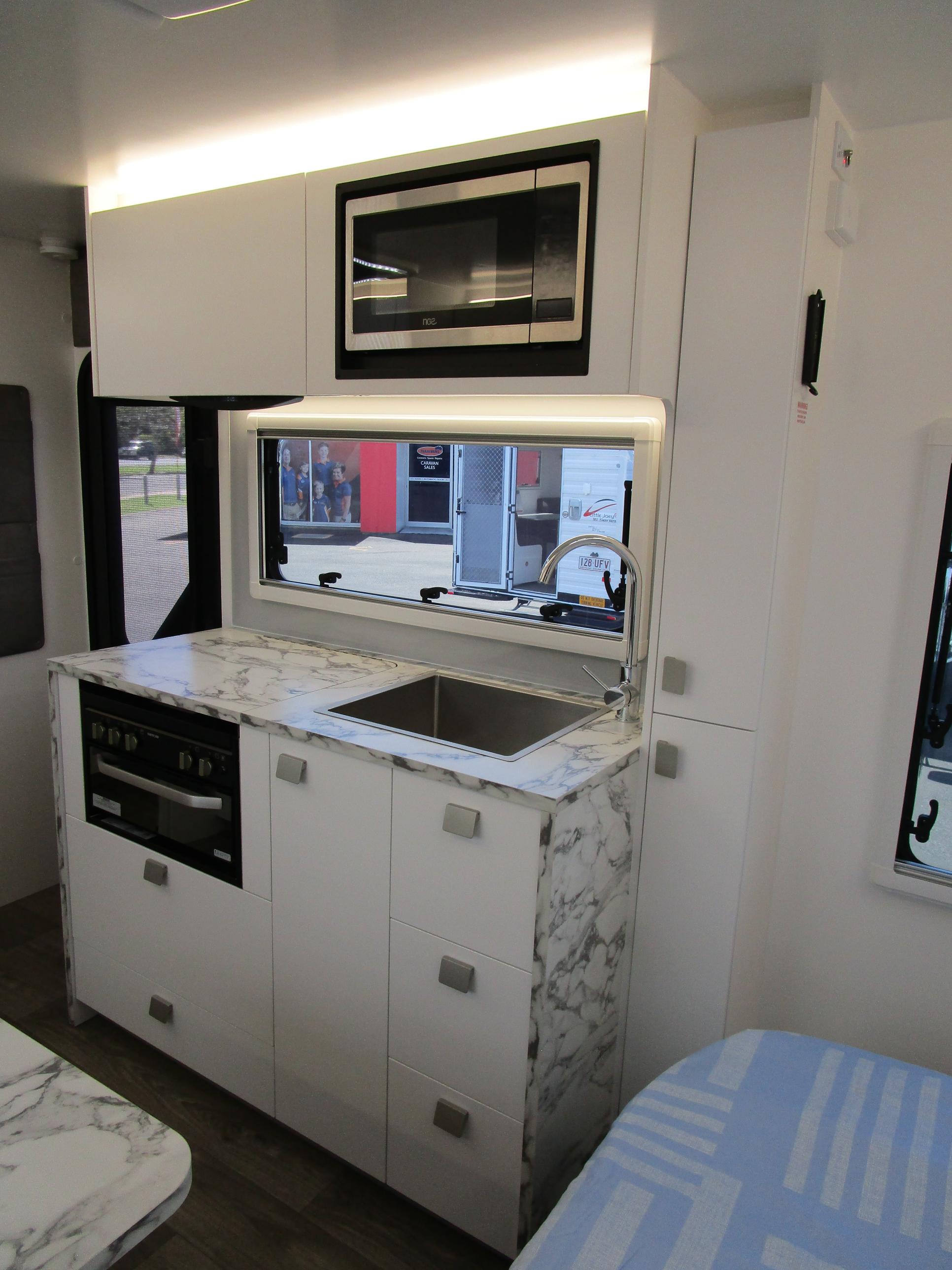 This year’s model debuts a new curved robe design, thicker 25mm benchtops, and a relocated kitchen to the door side for improved flow. The toilet has been repositioned to the roadside, creating a more efficient interior layout. Convenience is built in, with internal and external USB-C charging, a single-bowl sink without drainer, and acoustic panelling that enhances interior comfort and style.