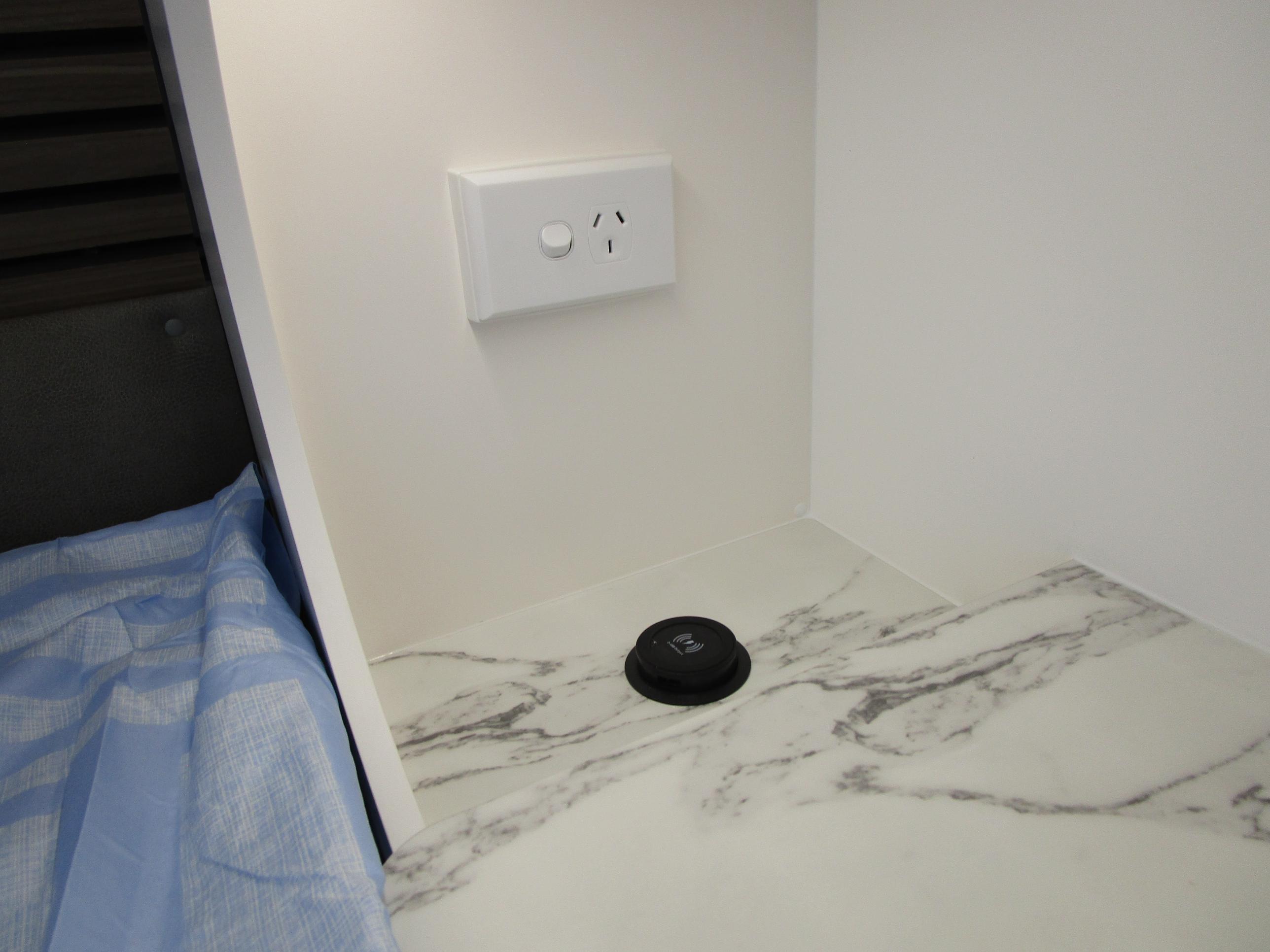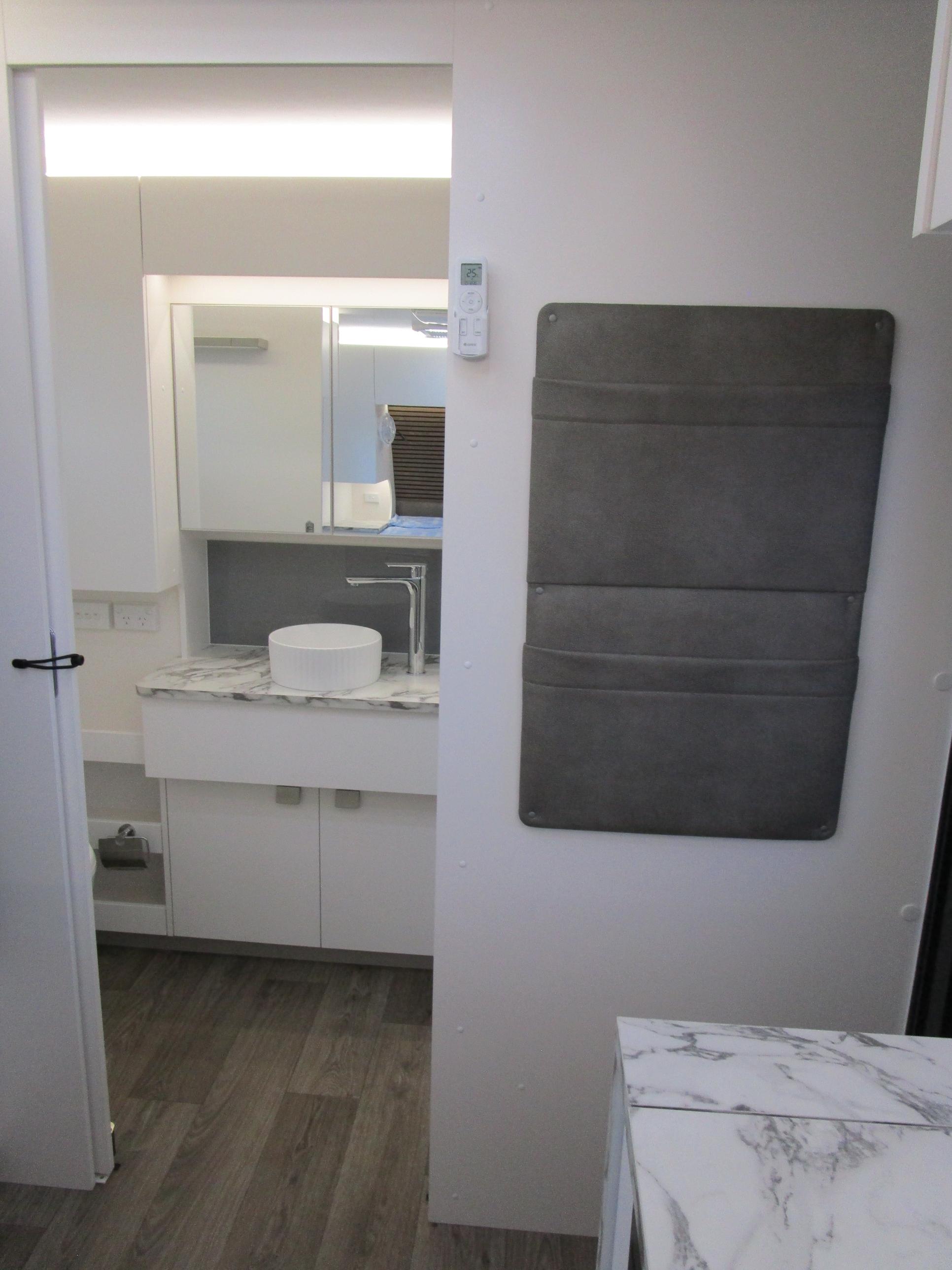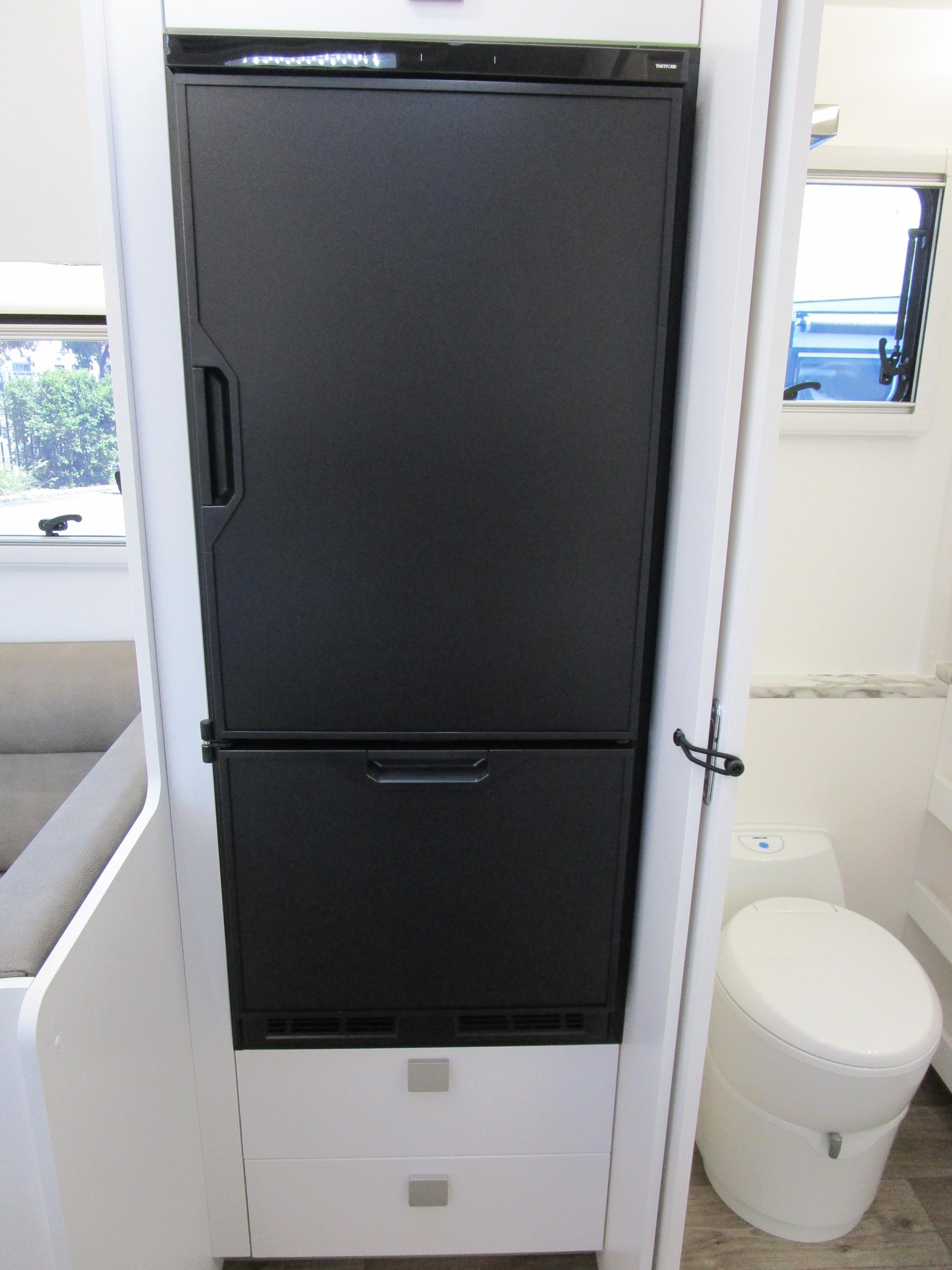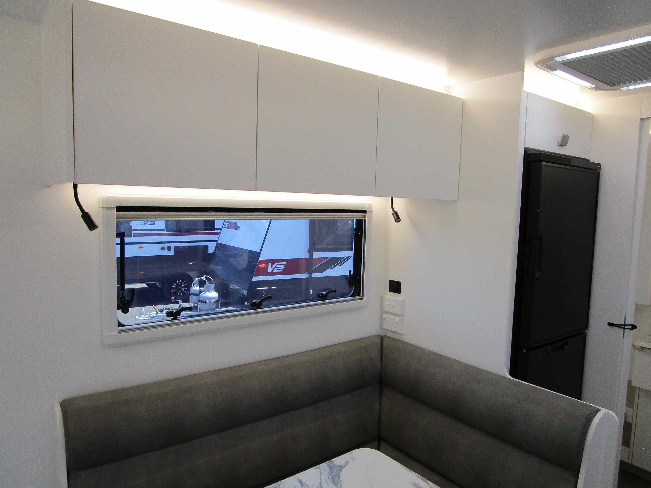 This year’s model debuts a new curved robe design, thicker 25mm benchtops, and a relocated kitchen to the door side for improved flow. The toilet has been repositioned to the roadside, creating a more efficient interior layout. Convenience is built in, with internal and external USB-C charging, a single-bowl sink without drainer, and acoustic panelling that enhances interior comfort and style.